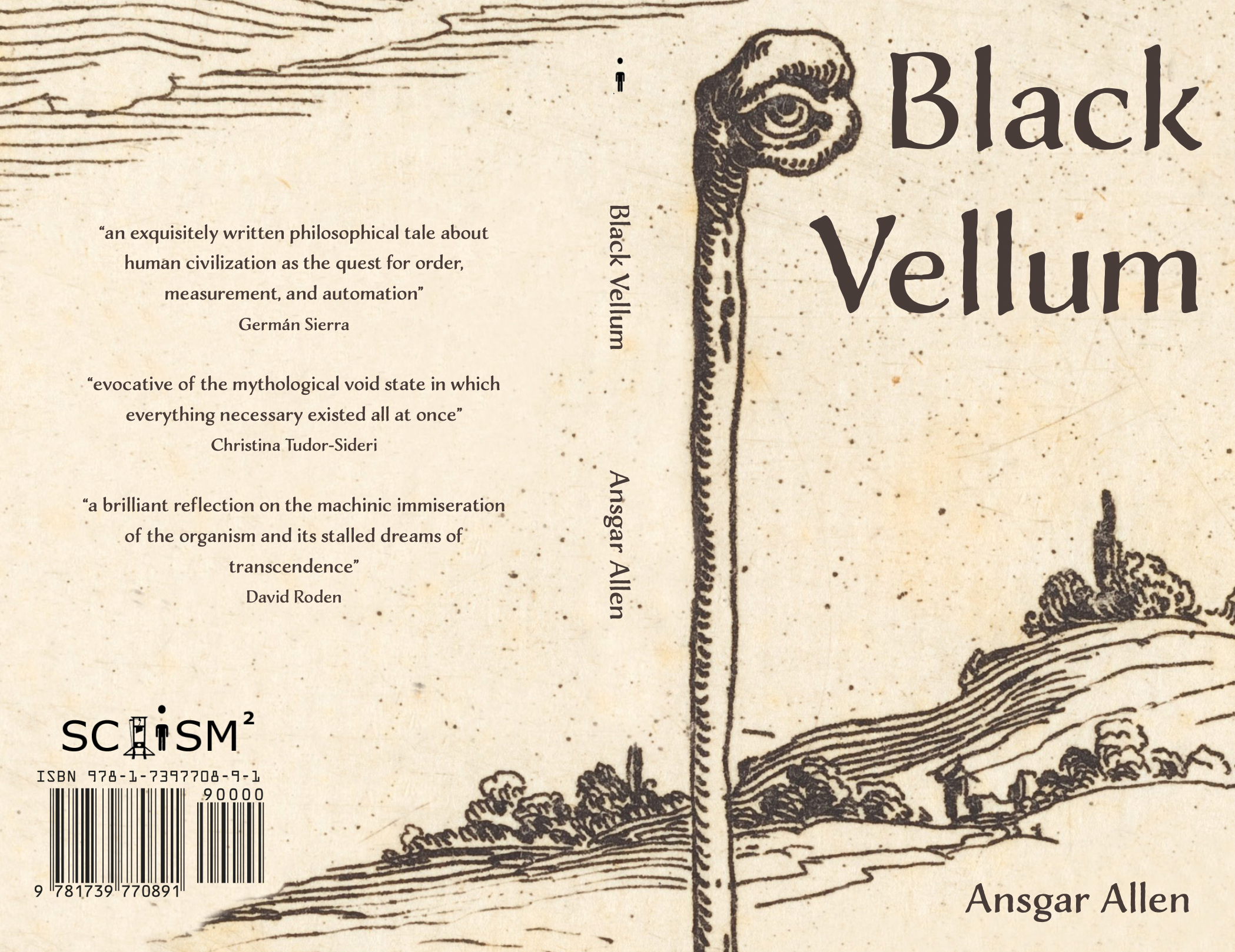 “A notepad wrapped in black vellum records a descent into a rift valley where an oddly abridged humanity hunkers, replicating its codes through geological time. A story within that story details the Frankenstein-like creation of a meat automaton, designed to render the consolatory function of religion obsolete. Transecting all of this, is a brilliant reflection on the machinic immiseration of the organism and its stalled dreams of transcendence. Allen has distilled the speculations of Nietzsche and Freud into an impersonal meatspace whose soulless protagonist is writing its own suicide note – while time dissolves all, while the space of inscription reveals caverns measureless to man. Black Vellum is the work of an extremely subtle mind, co-opting horror to trace the integuments of a glitching futurity somehow liberated from the traditional impasses of nihilism.” — David Roden