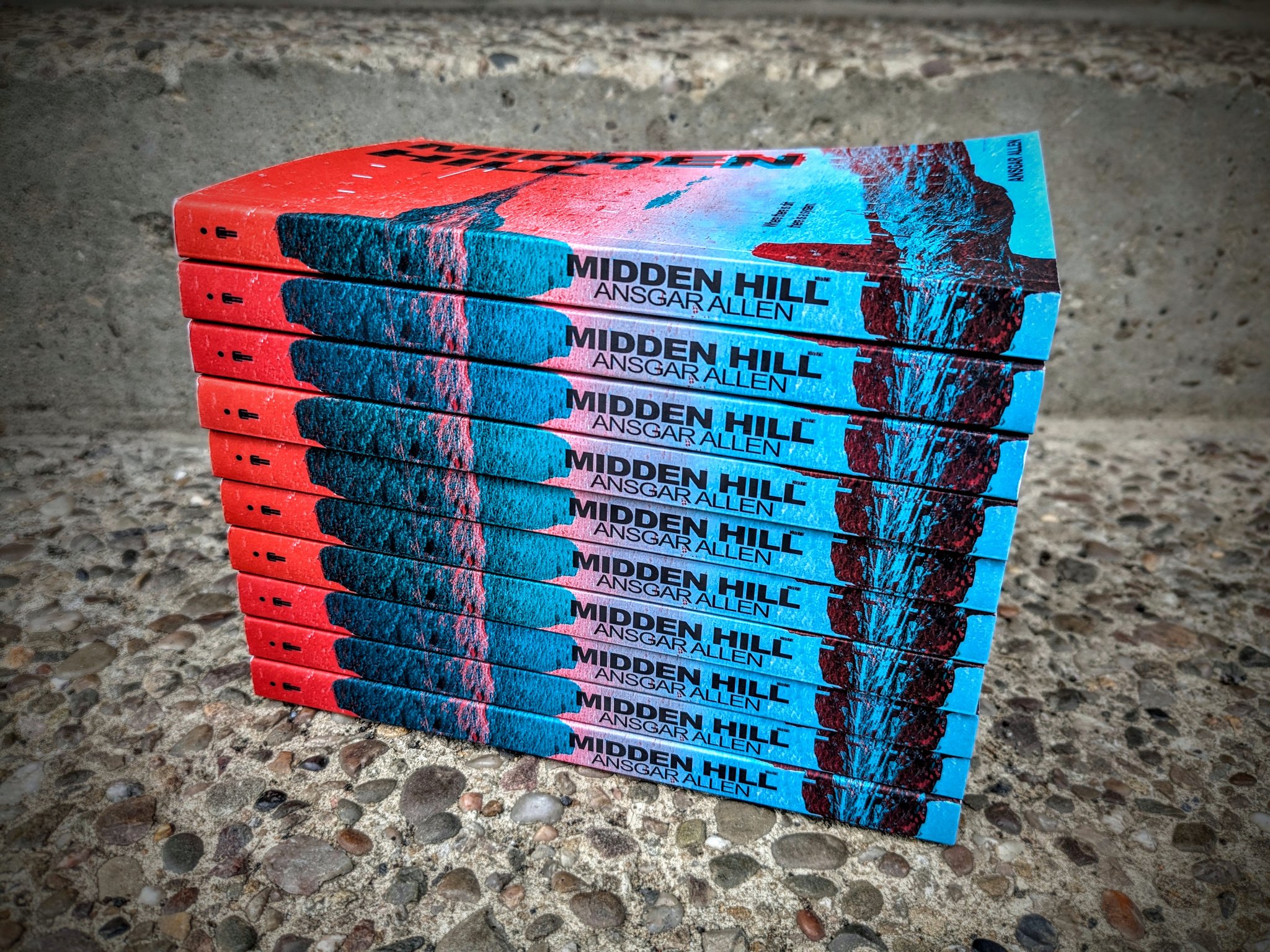 “‘Our assignment was this. To record what the islanders did and what they said.’ Ansgar Allen’s Midden Hill offers the mind-bending dictation of a patient to his doctor about his time spent on an island with a midden, an incredible refuse hill, in the centre. Reminiscent of J.G. Ballard’s Concrete Island, Allen offers a confounding examination of civilisation and its discontents. The midden on the island is described as the dumping ground for the entire planet, made up of ‘everything every culture has expelled from itself.’ An abject zone that ‘contains all defilements, all forbidden objects, all expulsions.’ The book opens with a quote from Mary Douglas, an anthropologist who writes about purity and uncleanliness, and the rituals of purification central to modern cultures. There is a system to man’s filth. His safety is predicated on his daily attempts to expel waste and form himself in opposition to this. The island seems to place all of that in jeopardy. It carries perverse rituals of its own, mirrored in the vortical writing of Allen, as his visitors navigate this land of symbolic chaos: the burning and inhalation of a mysterious weed, the appalling significance of a peeled egg. In a way, the book captures something of Kafka’s The Castle; an outsider caught in an alien system, tunnels and tunnels of endless rot.” — Matthew Kinlin