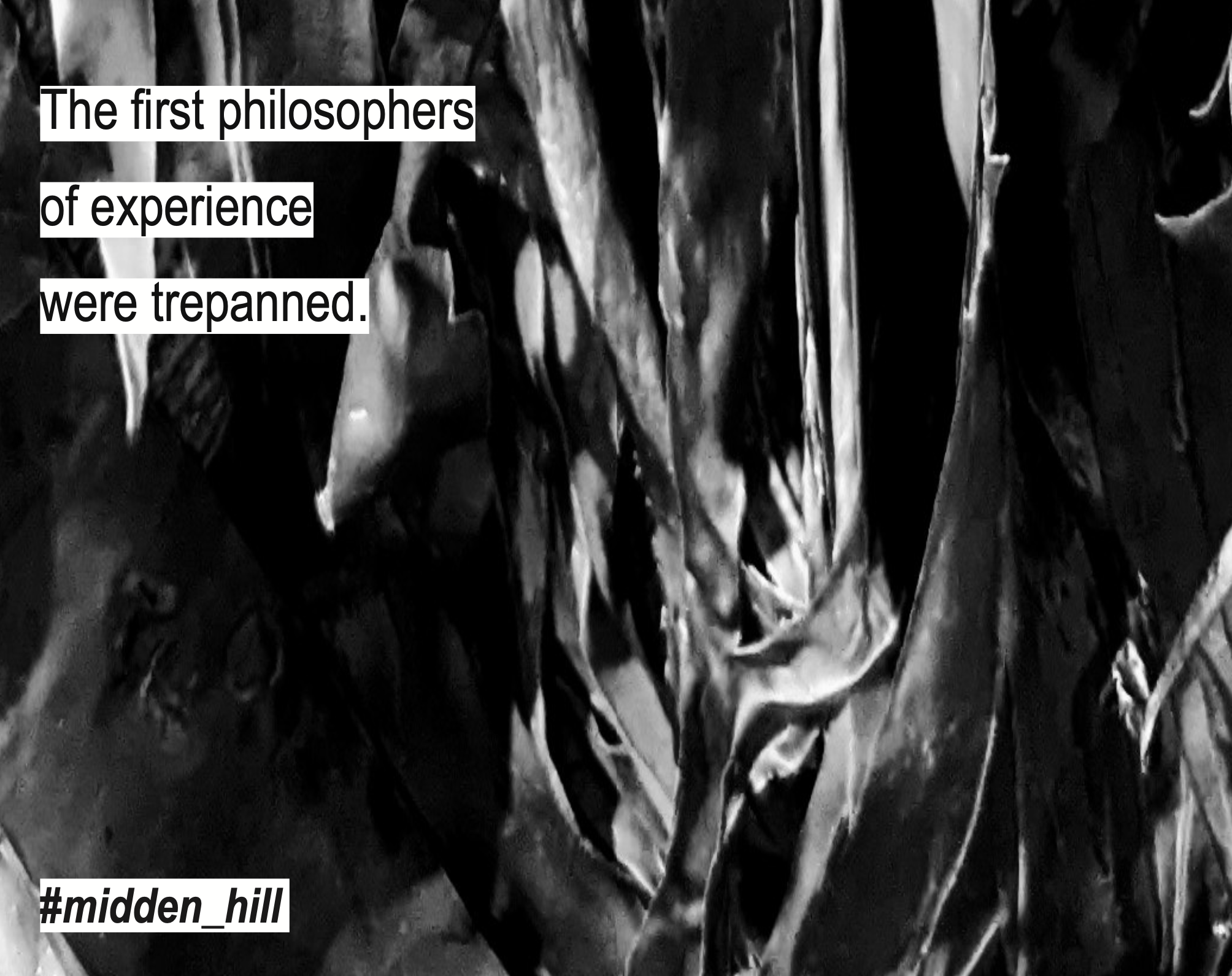 “Think of the mind as a vessel that takes in its exterior. It must surely liquify what it incorporates, boil it down, and then extrude only the finest scum of that concoction, otherwise the vessel would fill with a few short glances at the world it sees. Room must be made as well—if we think of the mind as a vessel—to allow the incorporation of forces. We may think of speech as a mechanism of removal, of the mouth as the first orifice of expulsion, and of the necessity of talking as the necessity of making room in the mind for its growth within the confines of the head. The skull cavity is the ultimate limit that halts growth and maintains humanity in its comparative ignorance. Trepanning—the boring of a hole into the head—has to be the most audacious of refusals of the limits of the mind. False testimony ascribes the origins of trepanning to the expelling of spirits, the treatment of madness, or to the evacuation of inner pressure. The origins of trepanning are poorly understood indeed. Few realise that the boring of skulls originated as a practice to rival the great philosophic inquisitors—the pioneers of philosophic thought before its systematisation—who themselves sought to take thought and perception to its extremities but had, or only employed to that purpose, their means of intellection for tools, a reflective pose that will never discover anything of the nature of existence from the serene aspect. Trepanation produced the first true philosophers of experience. The expulsion of spirits and the alleviation of madness were, if they were stated as reasons, mere stand-ins for a more serious purpose, a purpose which could not be articulated to the satisfaction of their non-trepanning peers. Perhaps too few survived even as the construction of the trephine, the circular auger, was perfected. But as they sat and had themselves bored out, they perceived levels of stimulus that the mind will not usually admit and saw the energies of the vastness outside of them with unfiltered clarity.”